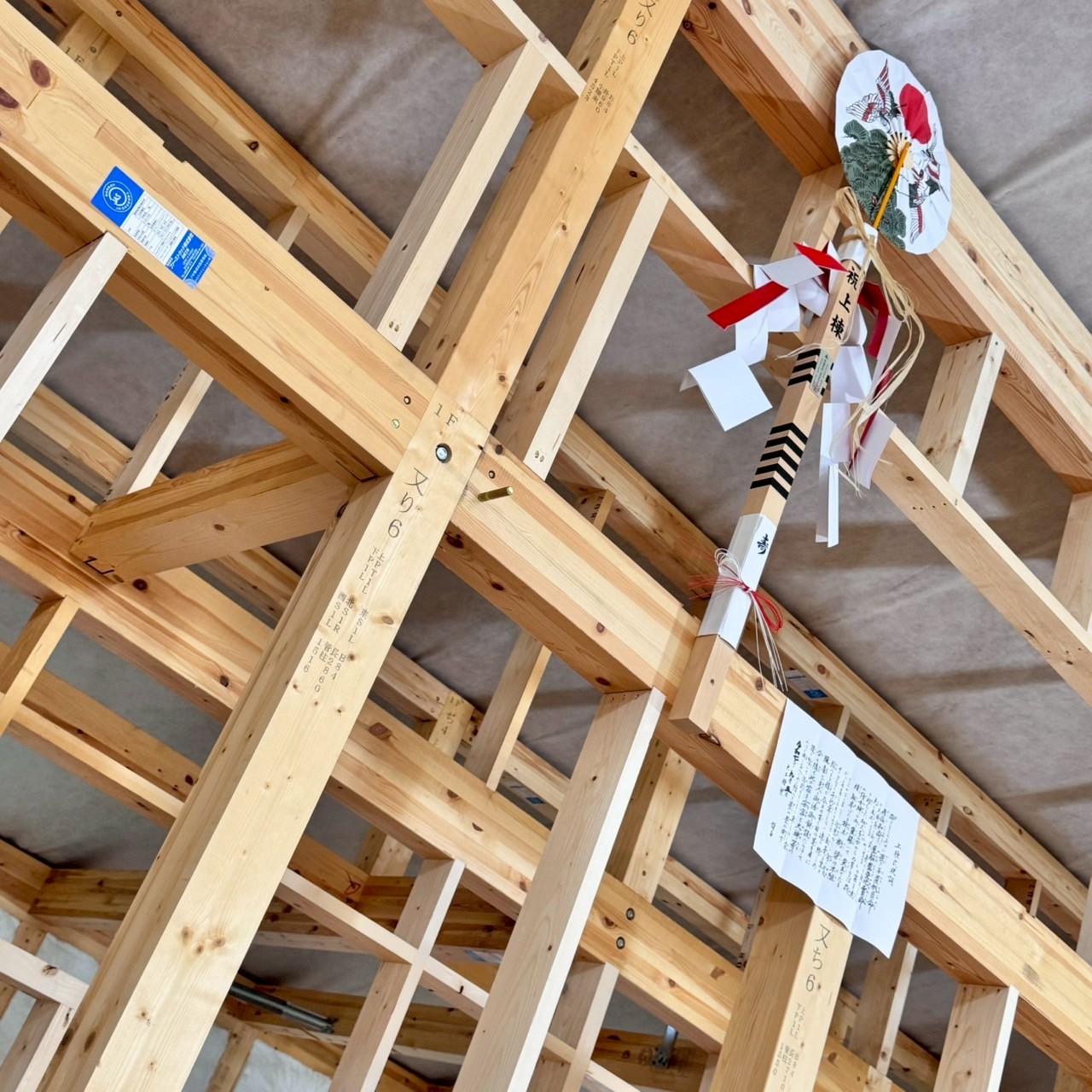 上棟の節目を祝し、上質で品質確かな建物の竣工と家族の幸せと繁栄を祈願します。