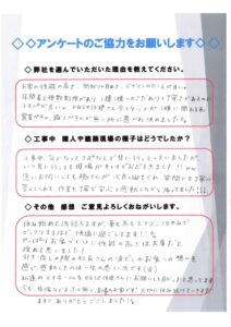 突然現場を見に行っても、毎回笑顔で迎えて下さり、主に6月~9月と一番暑い中工事をしていただきました。内側・外側に限らずいつ行っても現場がキレイで、気持ちが良かったです‼ こちらの優柔不断のせいで、変更したり、相談もたくさんしましたが、快く相談に乗っていただき、毎日とても快適な毎日を過ごせています。ハウスメーカーには無い対応力は、本当に素晴らしいと思います。